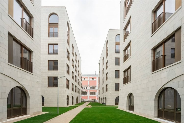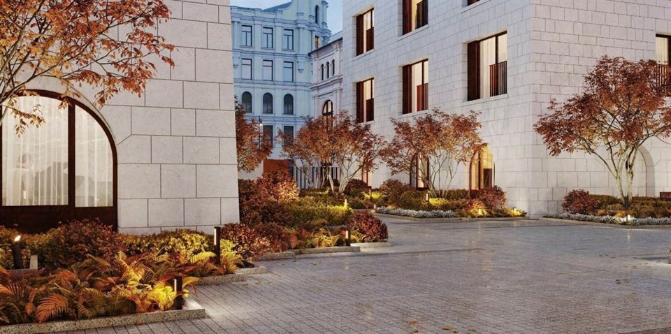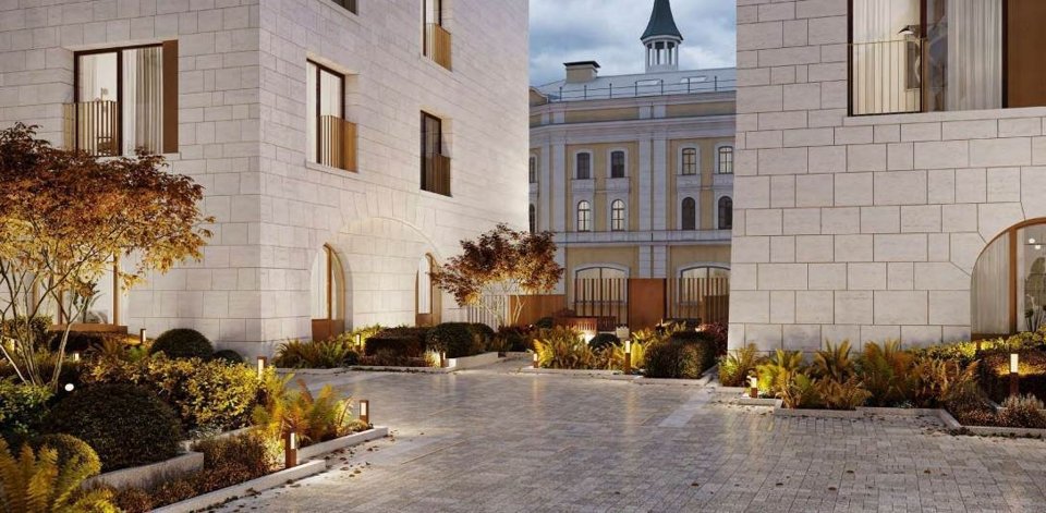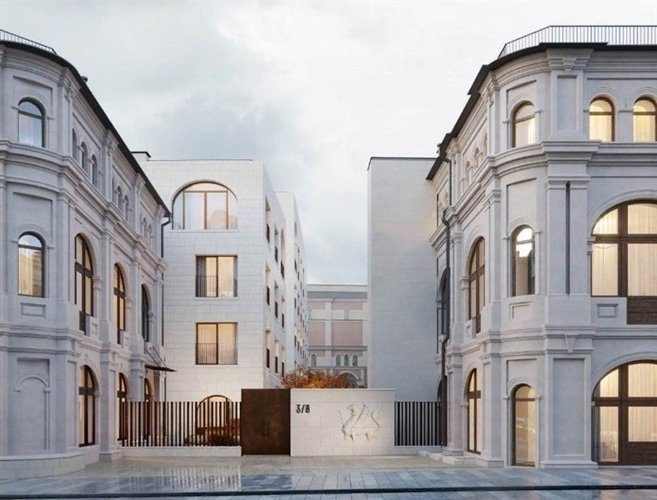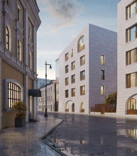 Архитектурная концепция новых корпусов проекта разработана российским бюро Kleinwelt Architekten. Она предполагает лаконичное решение белокаменных фасадов с арочными акцентами и деталями из благородной патинированной латуни и дерева, гармонирующее с историческими особняками.