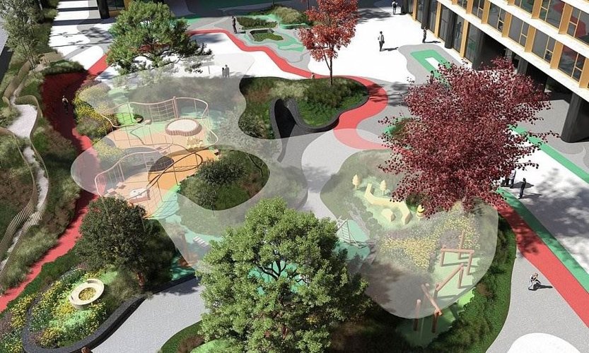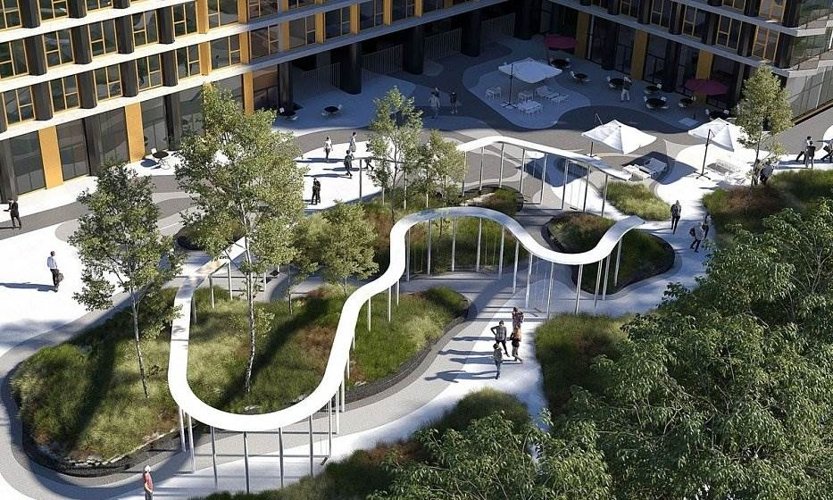 Оригинальная концепция благоустройства, где четко разделено общественное и приватное пространство позволяет создавать комфортную зону отдыха для резидентов и жителей района. Цветущий сад с разнообразными деревьями и растениями подарит ощущение спокойствия и гармонии. Дорожки для бега и пеших прогулок соседствуют с рампами для экстремальных видов спорта. Здесь продуманы самые разнообразные места для спокойных и активных занятий. Выпить чашку кофе с друзьями в кафе или посидеть с ребенком в тени деревьев — все это возможно в одном комплексе.